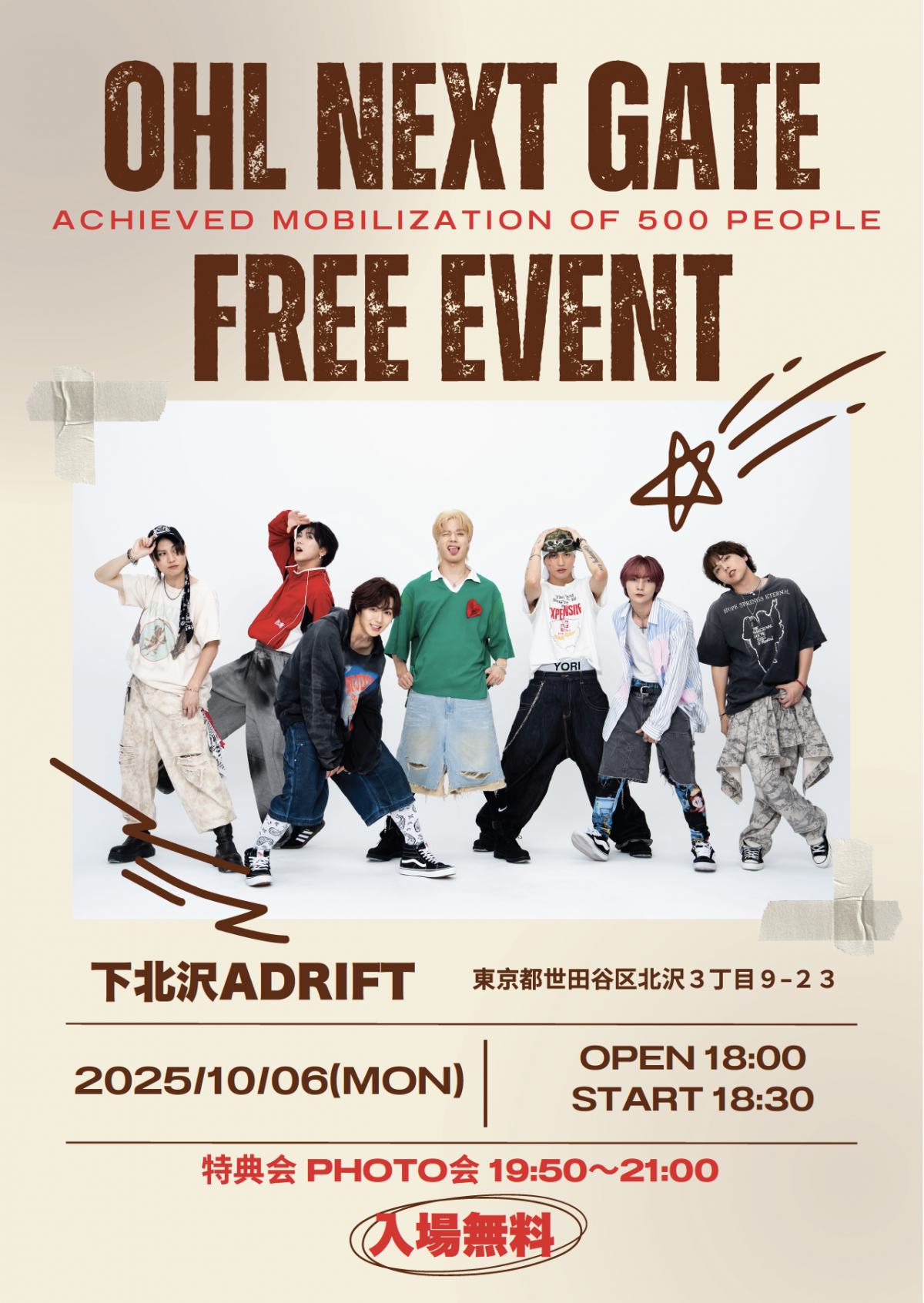 『OHL POP UP 1st』 OPEN 12:00 / CLOSE 16:00 物販受付終了時間 15:00 (予定) 『OHL “NEXT GATE FREE EVENT”』 OPEN 18:00 / START 18:30 -